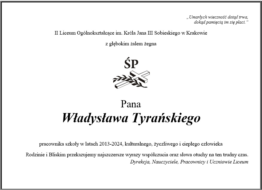5 lutego 2026 r. zmarł Władysław Tyrański (1952-2026) były opozycjonista, dziennikarz, odznaczony w 2019 r. Krzyżem Wolności i Solidarności. W latach 1977-1984 pracował w Ośrodku Badań Prasoznawczych w Krakowie. Od 1980 r. należał do „Solidarności”. Był współorganizatorem drugoobiegowego wydawnictwa Polowe Archiwum Prasowe Kraków, wydającego w latach 1983-1989 poza cenzurą tygodnik „Mała Polska”, a także w latach 1984-1985 miesięcznik „Archiwum Współczesne”. Pisał teksty, organizował konspiracyjny druk oraz sieci kolportażu bezdebitowej prasy. Od 1986 r. był redaktorem naczelnym „Małej Polski”. W latach 1989-1990 pracował jako dziennikarz tygodnika „Solidarność”, w latach 1990-1991 – „Czasu Krakowskiego” i „Dziennika Polskiego”. Źródło: IPN.